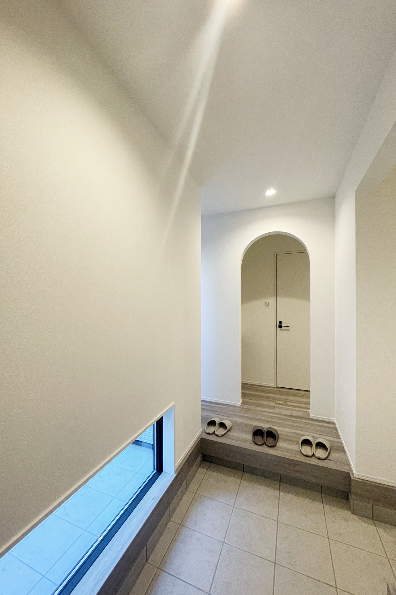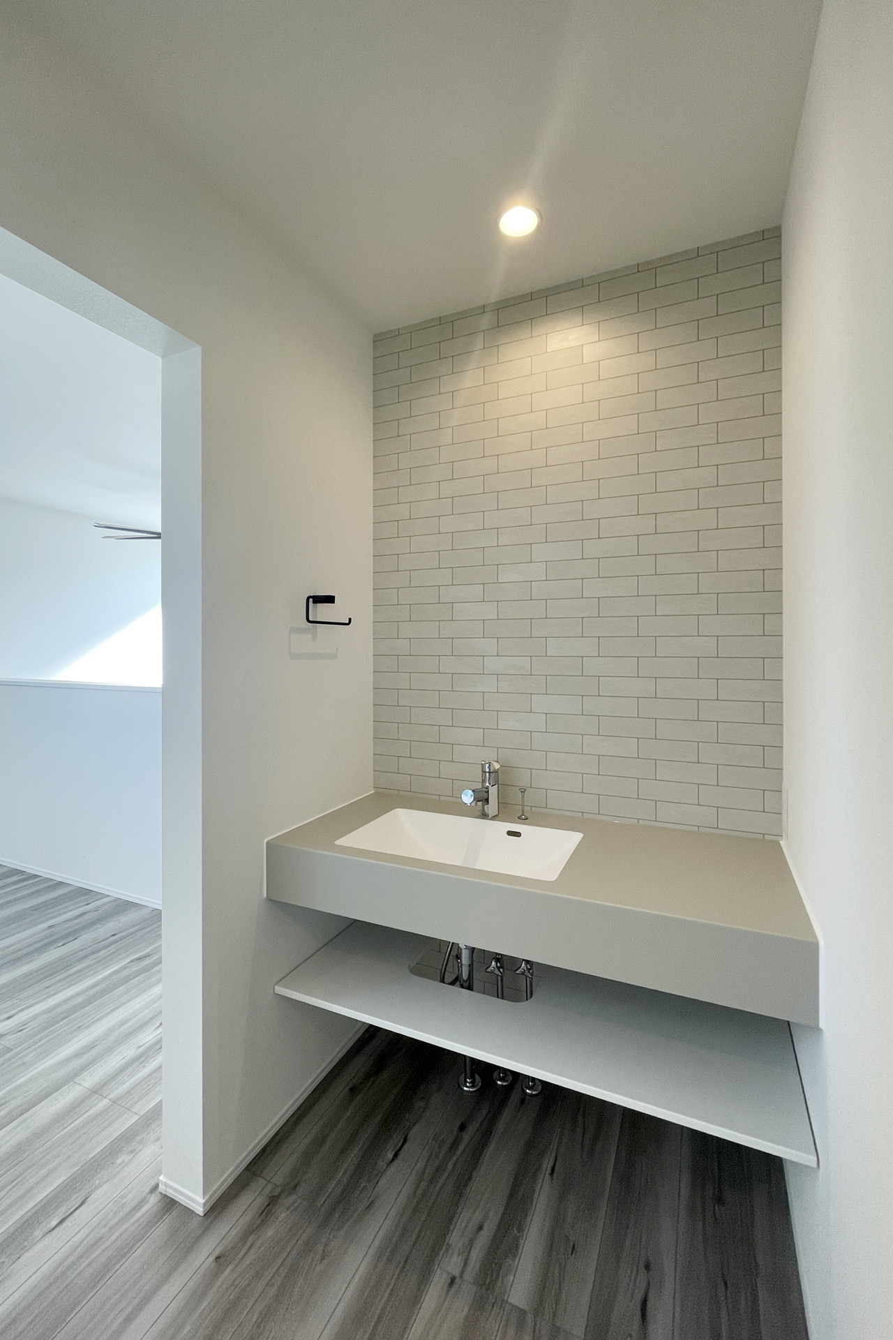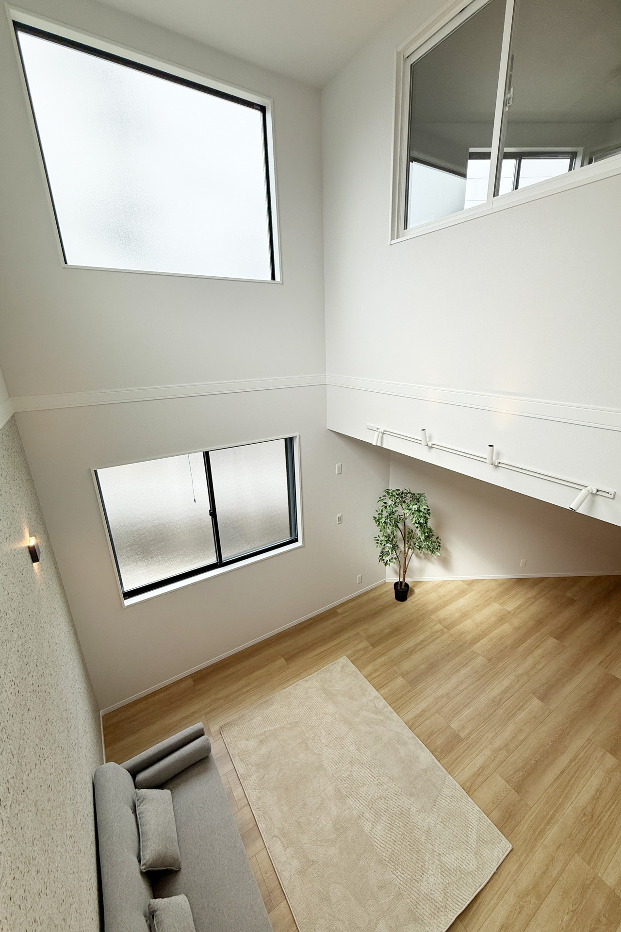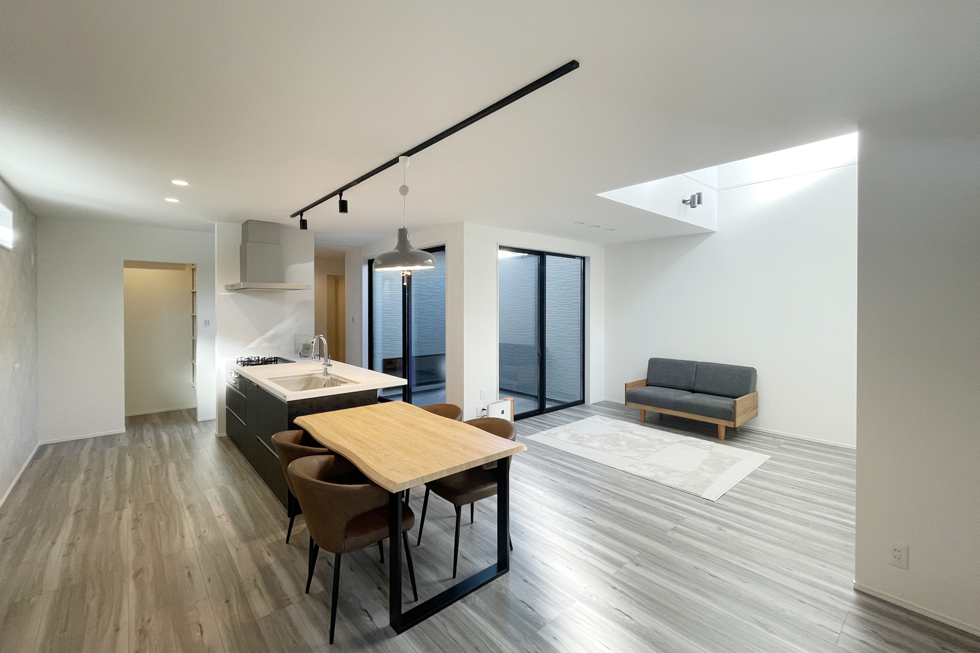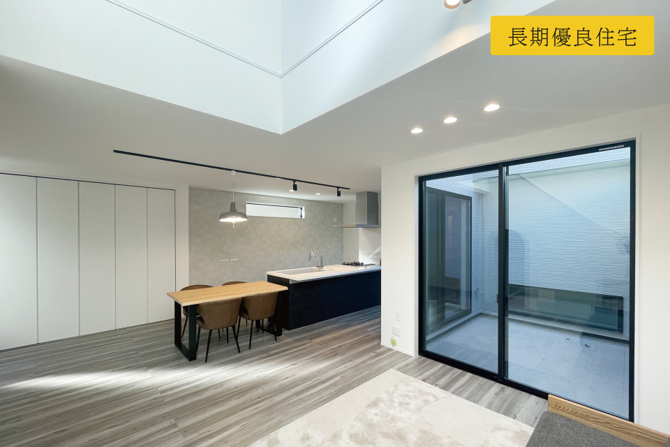 22.5畳の大空間を確保したLDKは、リビング上部は吹き抜けとなっており、南側からの陽光もたっぷり!玄関ホールから繋がるキッチン横のパントリーがポイント!