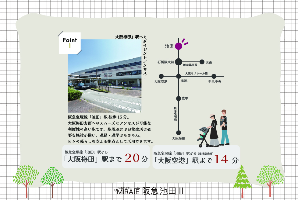阪急宝塚線「池田」駅まで徒歩15分。大阪梅田方面へもスムーズにアクセスでき、通勤・通学はもちろん、休日のお出かけにも便利な立地です。