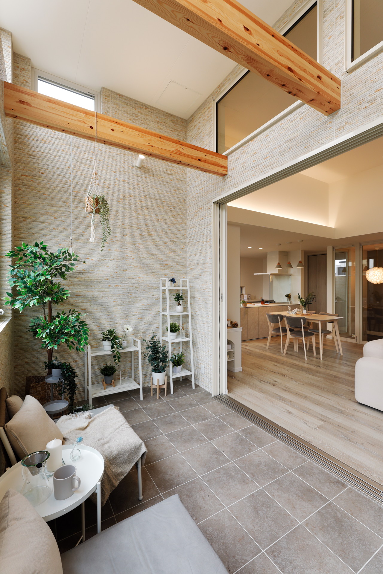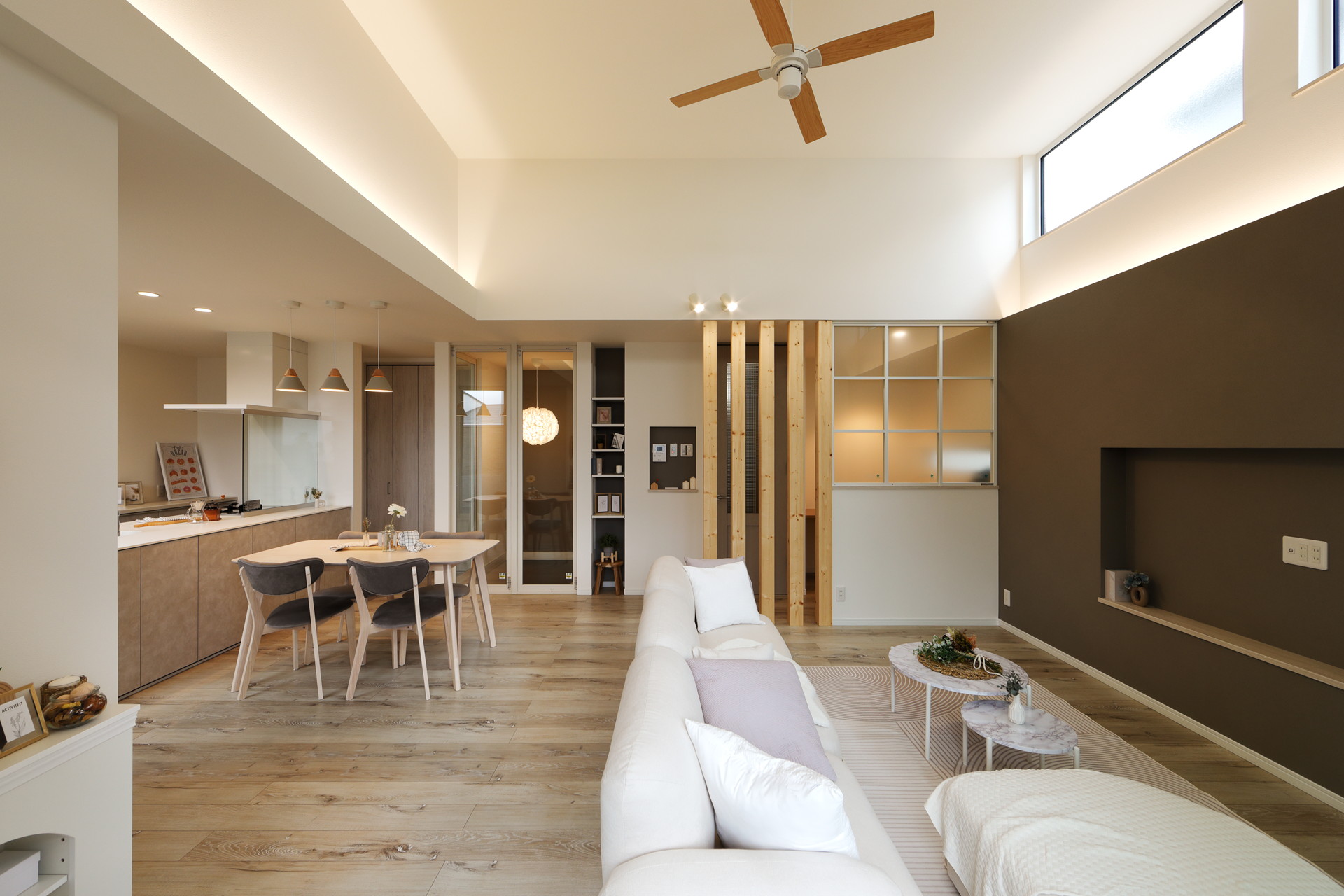 豊中市に完成した「maison terrace〜陽だまりテラスのある家〜」。一般的な住宅の約1.5倍という天井高が生み出すこの空間では、高い位置から差し込む陽光が室内をまるで屋外のように照らし、日中は照明いらず。光の中で過ごすだけで、なんでもない一日がすこし豊かに感じられます。休日はインナーテラスでコーヒーを片手に読書をしたり、お子様と並んで日向ぼっこをしたり。贅沢な気分になれる場所が、毎日の暮らしの中にあります。また、回遊できるキッチンは、気づけば家族全員がキッチンを囲む。家族が自然と集まる設計に。