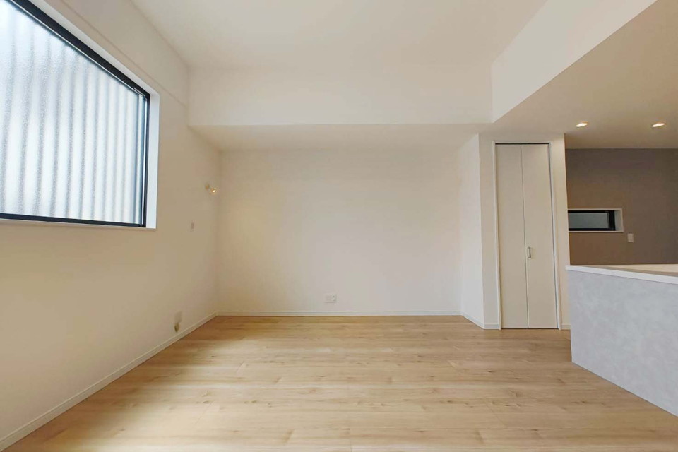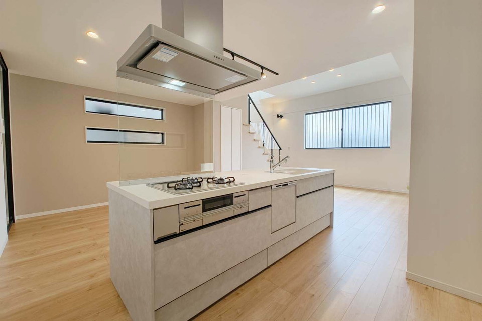 大人の落ち着いたアースカラーをベースにした内装空間の『大人カワイイ家』。帰宅後すぐに出迎えてくれる広々としたLDK空間は、キッチンを中心としたレイアウトで、家族が自然と集まりやすい間取りになっています。リビング上部には大きな吹き抜けのある、開放感たっぷりの空間が完成しました。