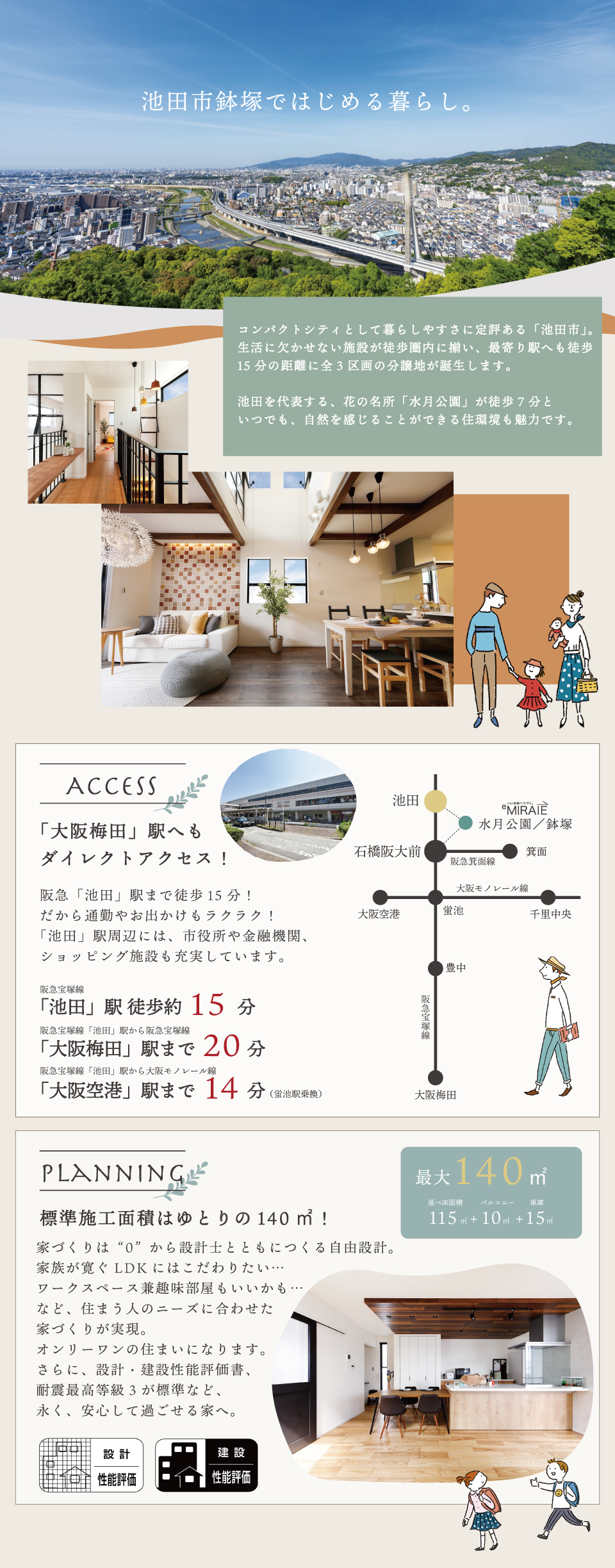 急行停車駅の阪急宝塚線「池田」駅まで徒歩15分。「大阪梅田」駅へは急行で約20分と、通勤通学や休日のお出かけもらくらく。「大阪空港」駅へも快適アクセス!