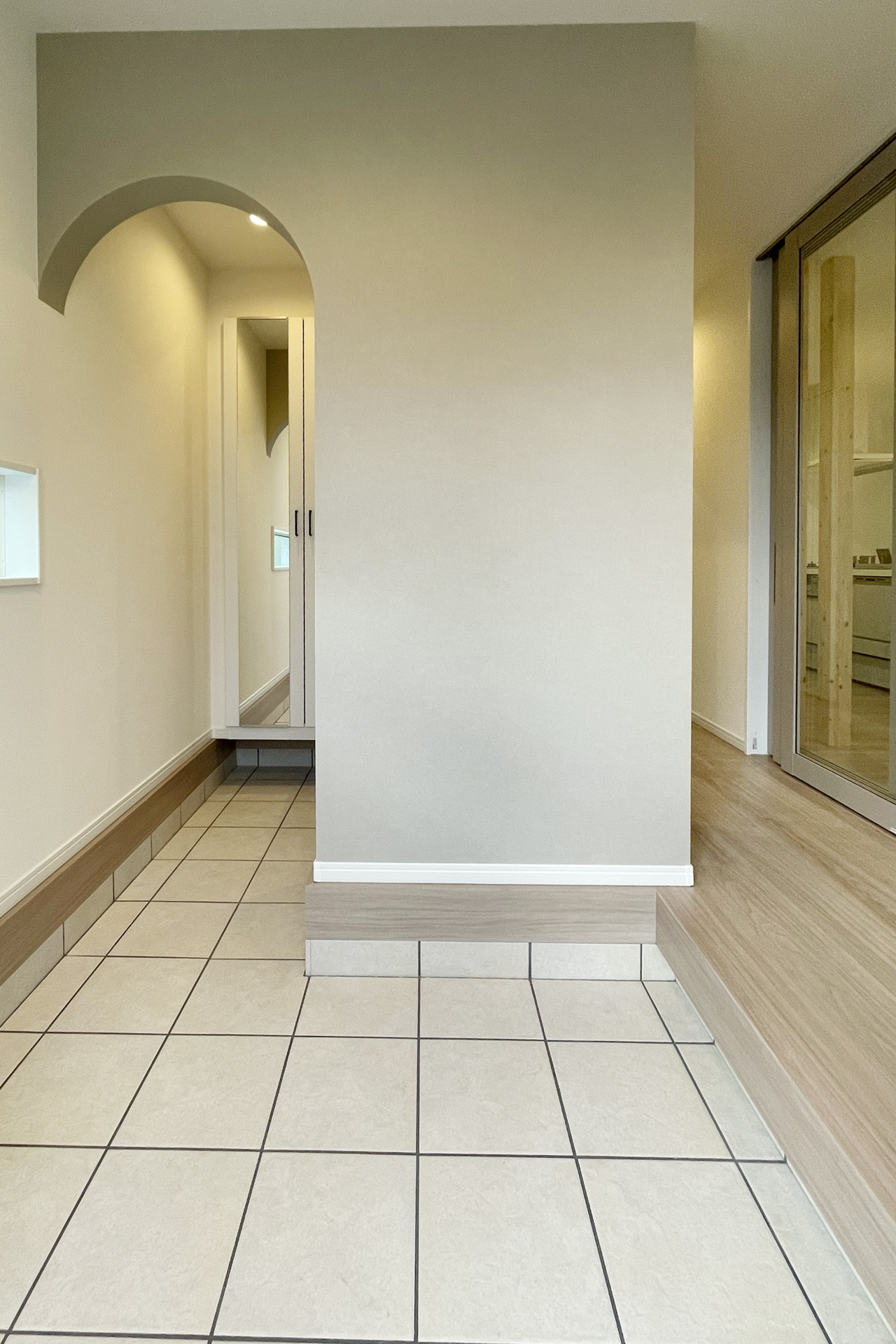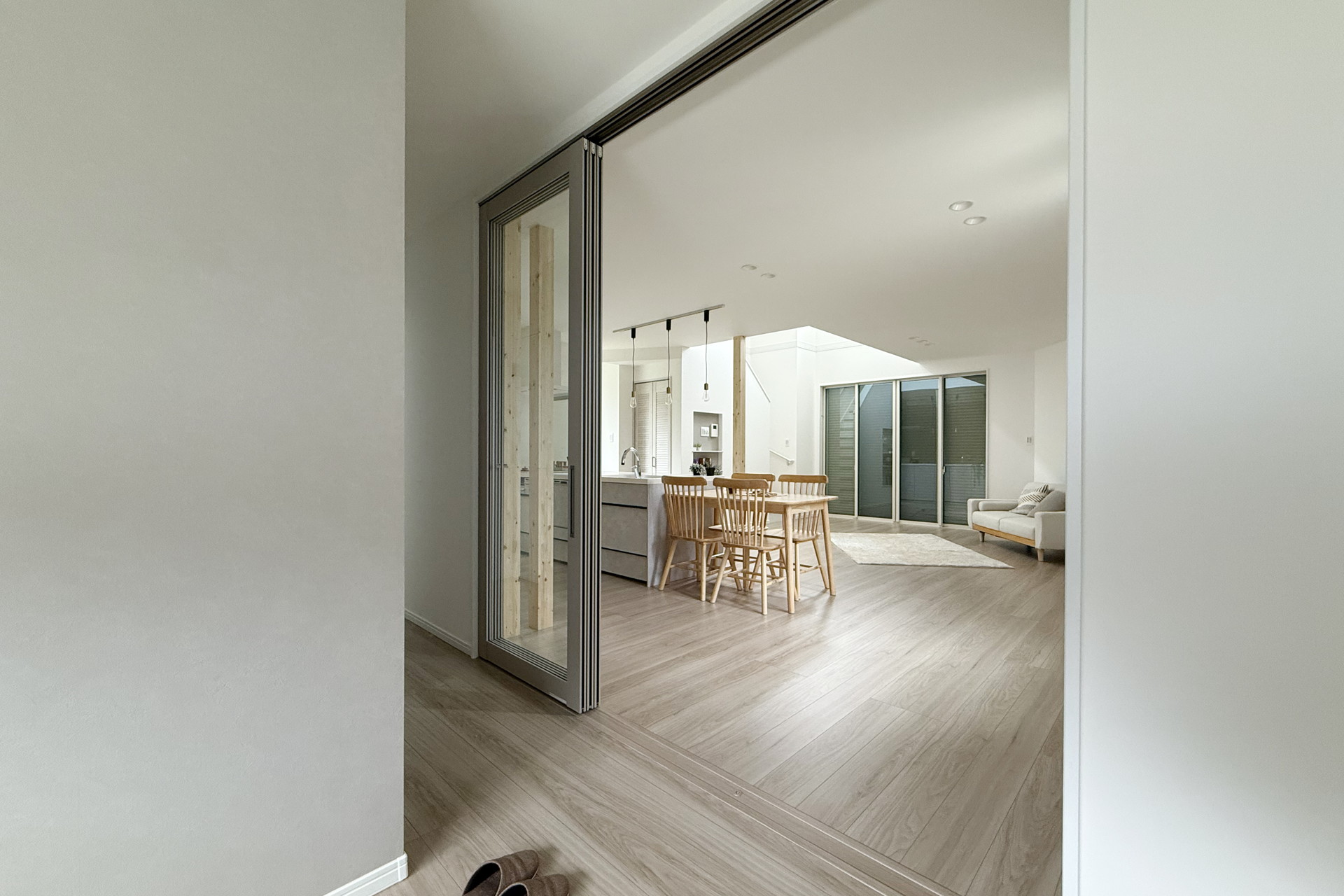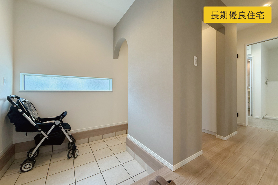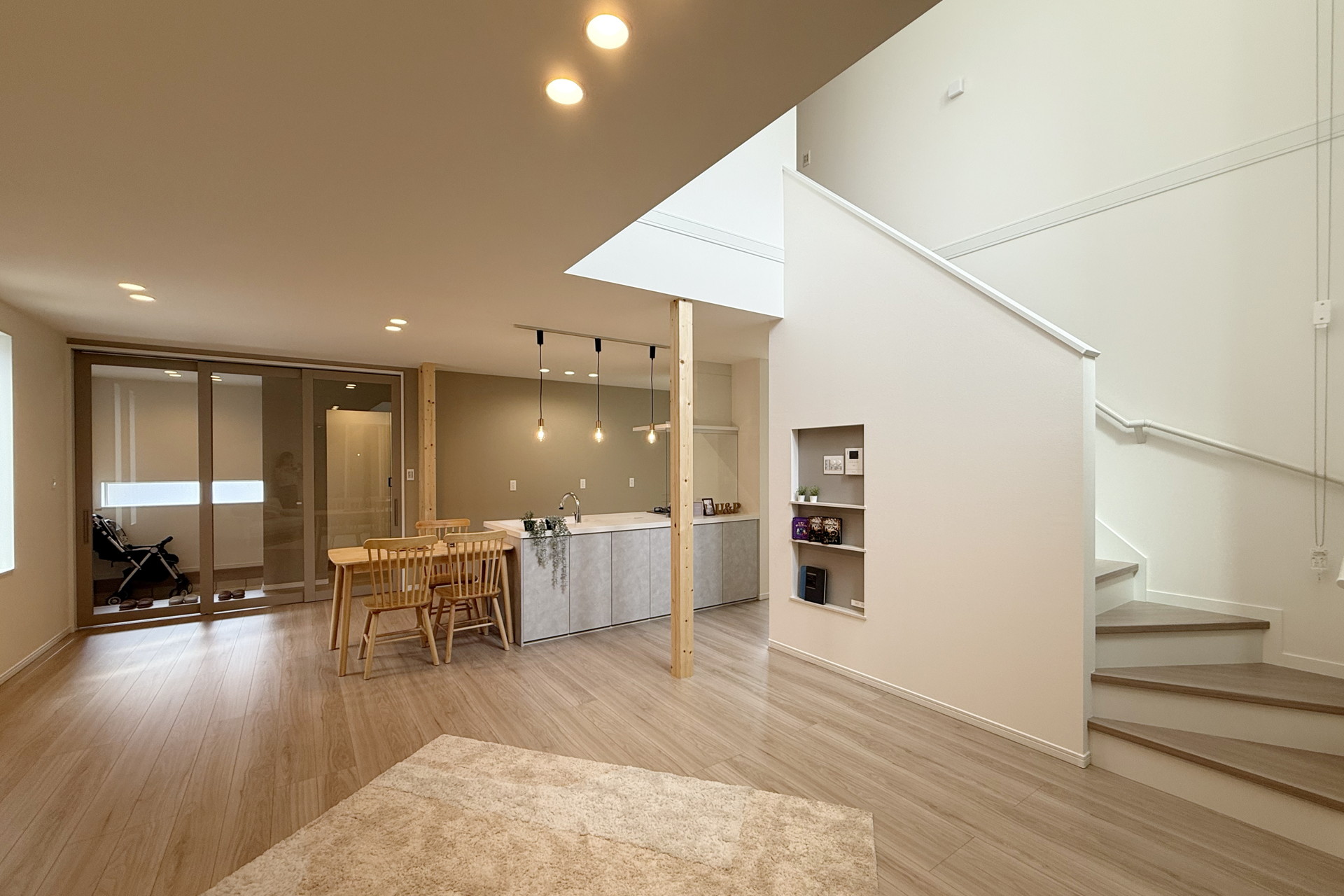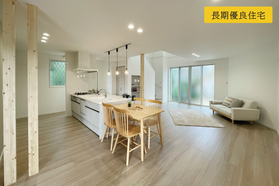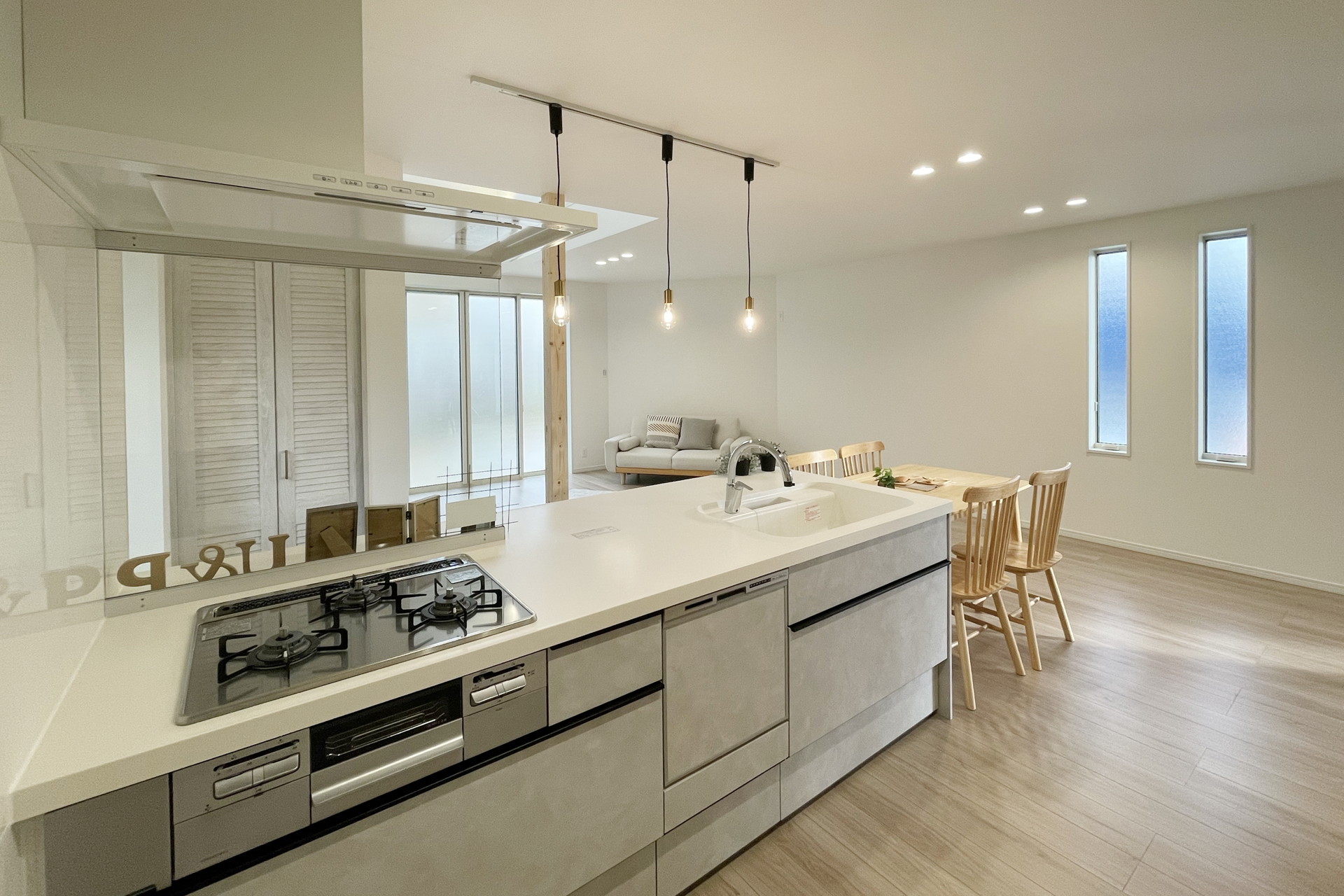 LDKはゆとりの22.3畳を確保!アイランド風キッチンは回遊動線可能。リビングの南東側にはちょっとした庭スペースも。ウォークスルータイプのシューズクロークも便利です。