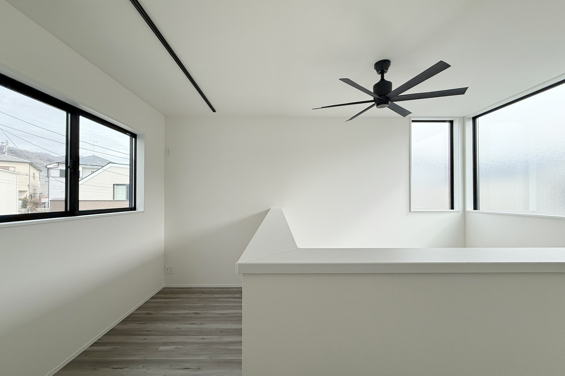 約22畳超の広々としたLDKには大きな吹き抜けと、外部からの目線が気になりにくい塀の高いバルコニーで、開放感を作りつつプライバシーの守りやすい住まいが実現。吹き抜けとバルコニー上部から部屋に差し込むたっぷりの陽光で、日中には照明いらずの明るさになるようにこだわっています。バルコニーの塀は高く設計することで、本来目線の先にあった道路から隠し、子どもと一緒に外を感じながら遊ぶことが可能になります。いつでも安心にのびのびと過ごせる空間づくりを工夫しています。