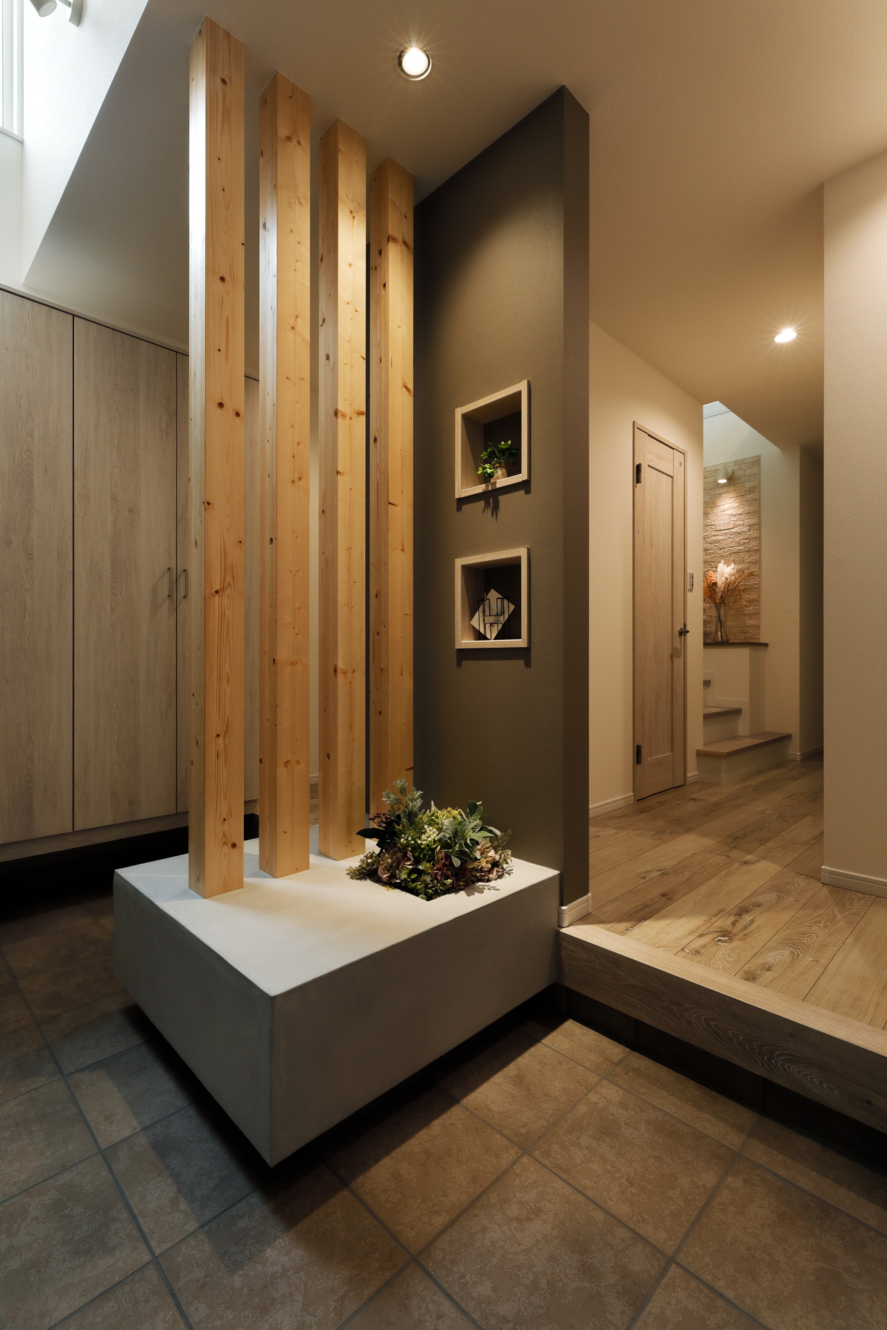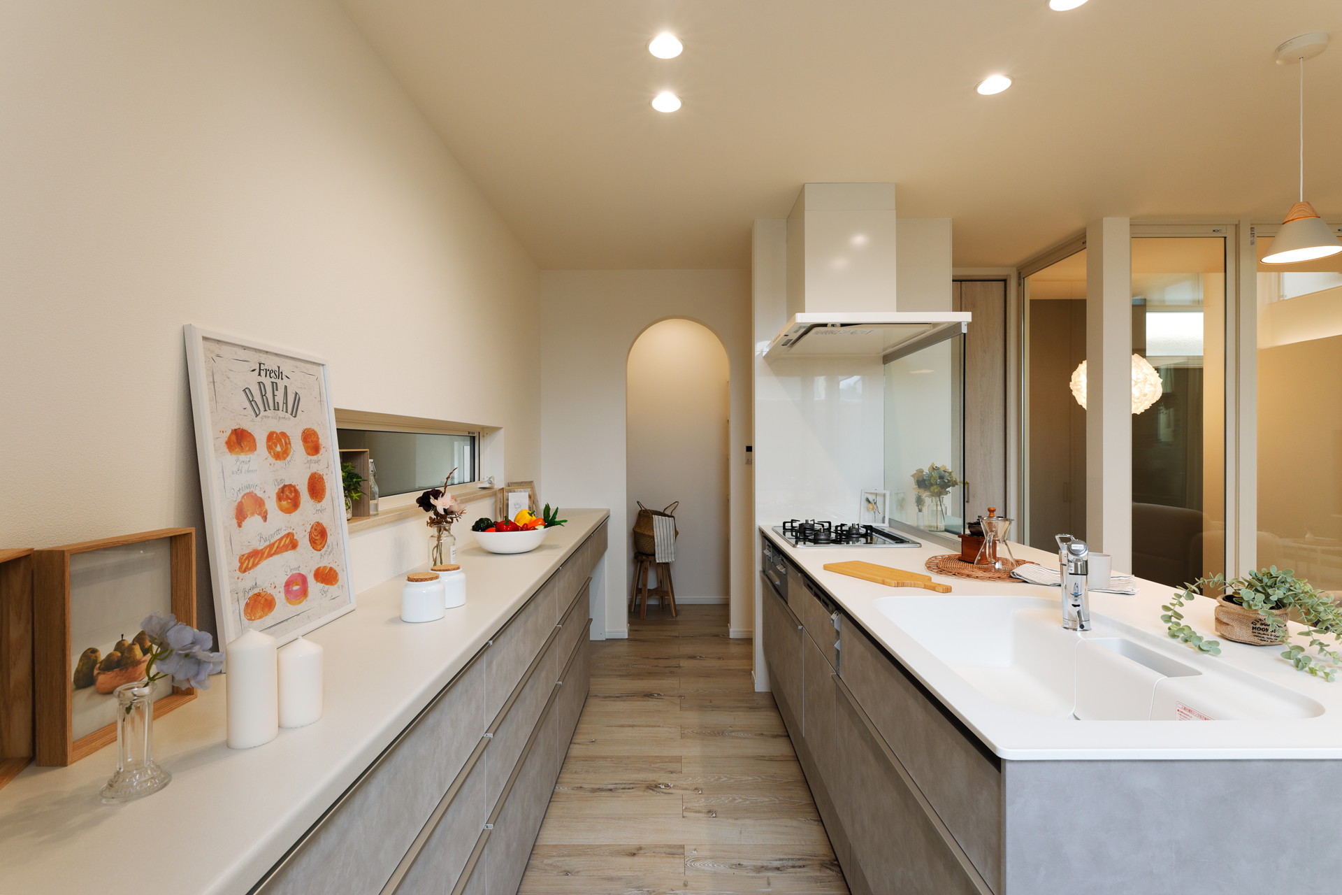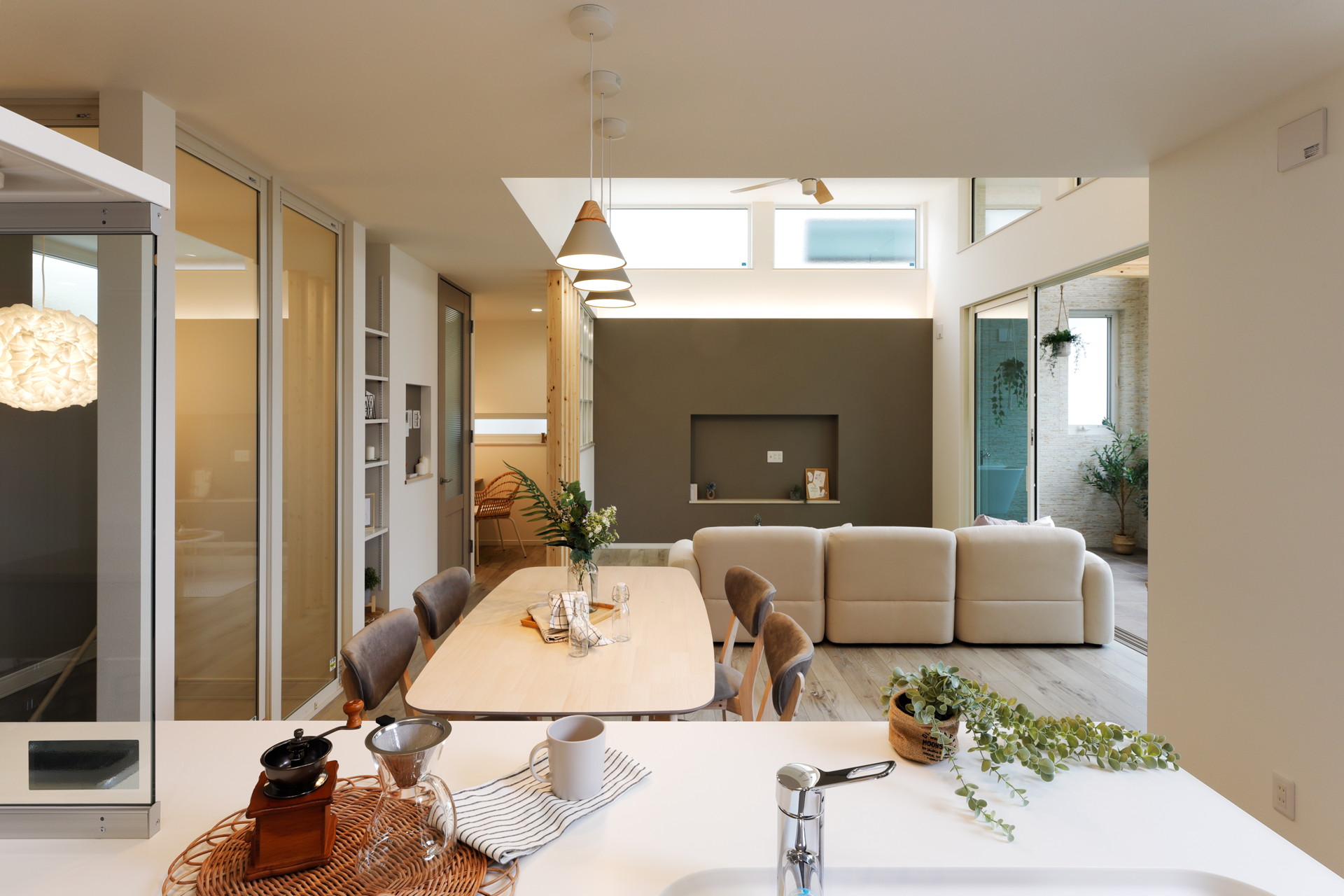豊中市に完成した「maison terrace〜陽だまりテラスのある家〜」。一般的な住宅の約1.5倍という天井高が生み出すこの空間では、高い位置から差し込む陽光が室内をまるで屋外のように照らし、日中は照明いらず。光の中で過ごすだけで、なんでもない一日がすこし豊かに感じられます。休日はインナーテラスでコーヒーを片手に読書をしたり、お子様と並んで日向ぼっこをしたり。贅沢な気分になれる場所が、毎日の暮らしの中にあります。また、回遊できるキッチンは、気づけば家族全員がキッチンを囲む。家族が自然と集まる設計に。