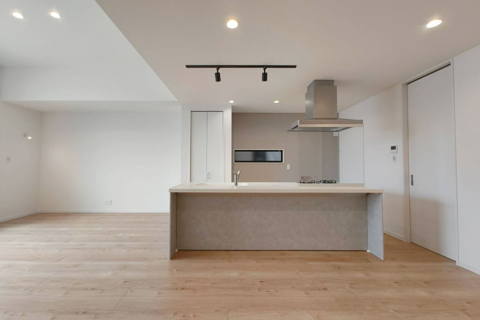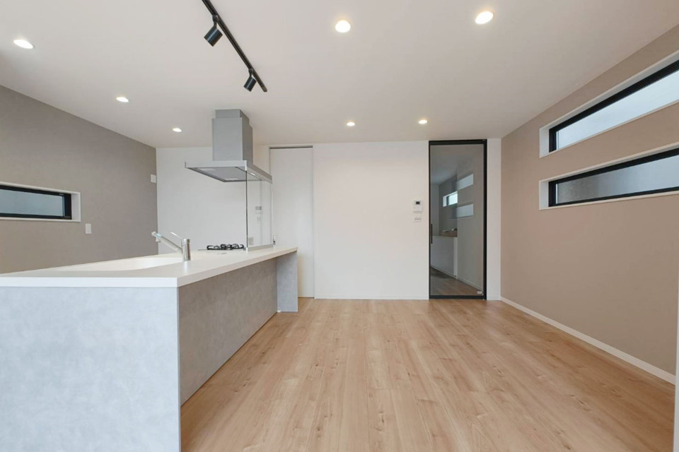 大人の落ち着いたアースカラーをベースにした内装空間の『大人カワイイ家』。帰宅後すぐに出迎えてくれる広々としたLDK空間は、キッチンを中心としたレイアウトで、家族が自然と集まりやすい間取りになっています。リビング上部には大きな吹き抜けのある、開放感たっぷりの空間が完成しました。