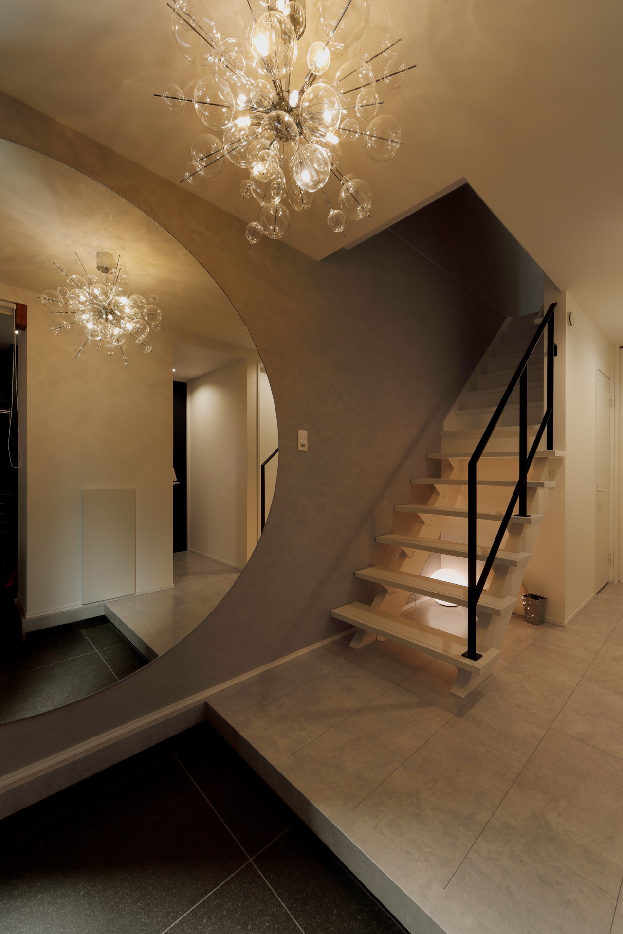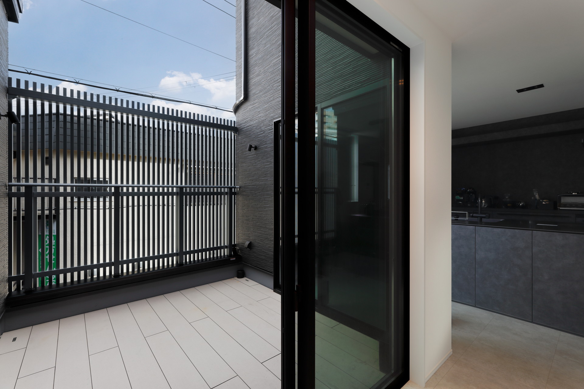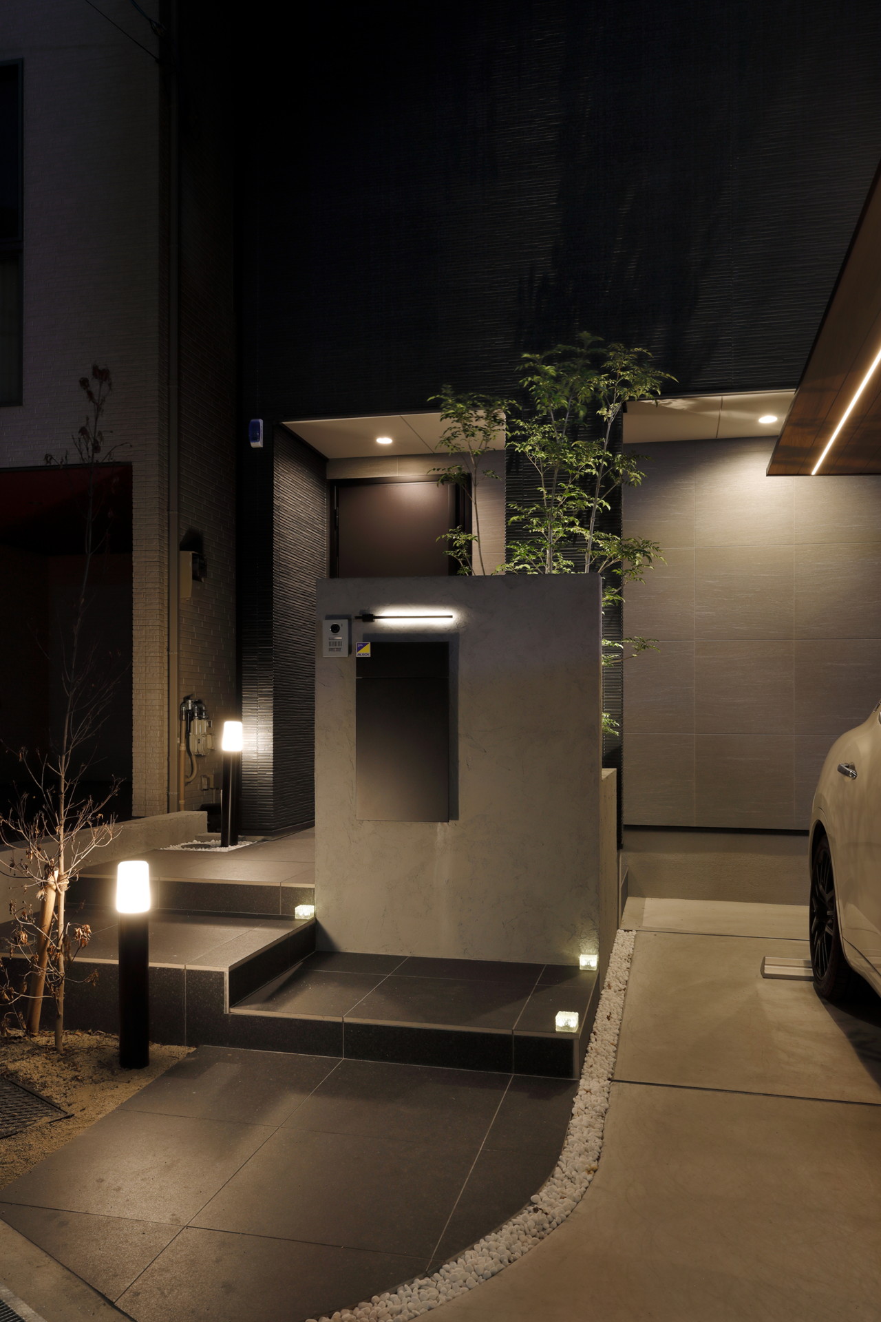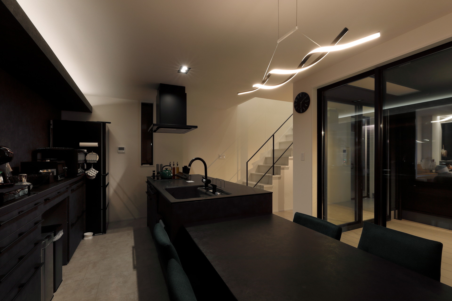 2階建てにすることも予定していたが、3階建にしても標準価格が変わらないというところに加え、空間一つ一つを広く取れるところに魅力を感じ、北摂という利便性の高さと暮らしの豊かさをどちらも実現。インナーバルコニーは外の視線を気にせず過ごすことができ、家族でBBQなども。リビングとキッチンダイニングで挟むようにレイアウトされたインナーバルコニーがあることで、LDK全体が開放感で包まれた奥行き感じる空間になりました。玄関は、框の高さを下げることでホテルのような敷居を低くしたリラックスさを演出。さらに1階から上がる階段は抜け感をプラスし、フロアライトから溢れる柔らかい光とこだわりのペンダントライトで高級感のあるシンプルモダンなインテリアが完成しました。