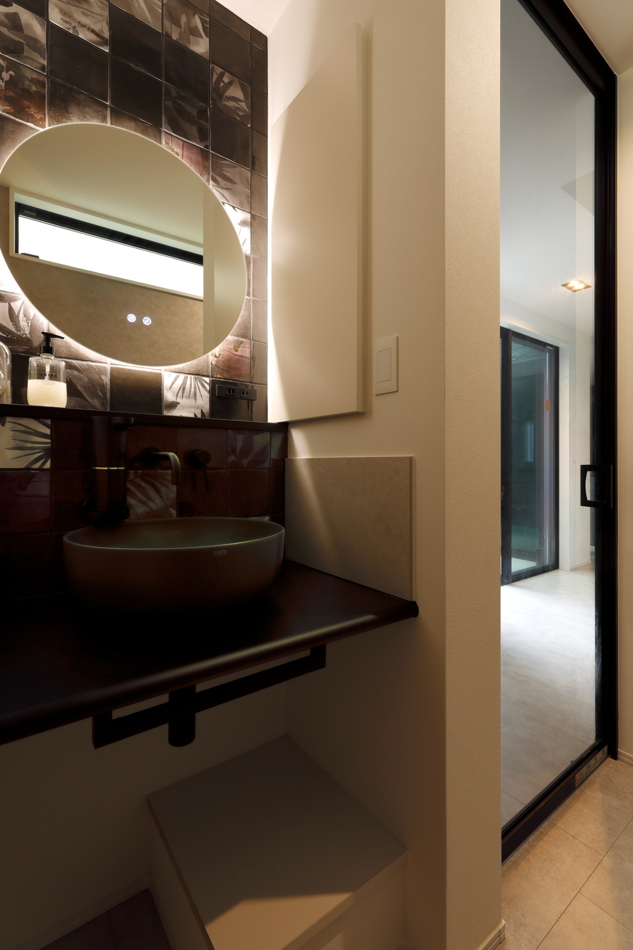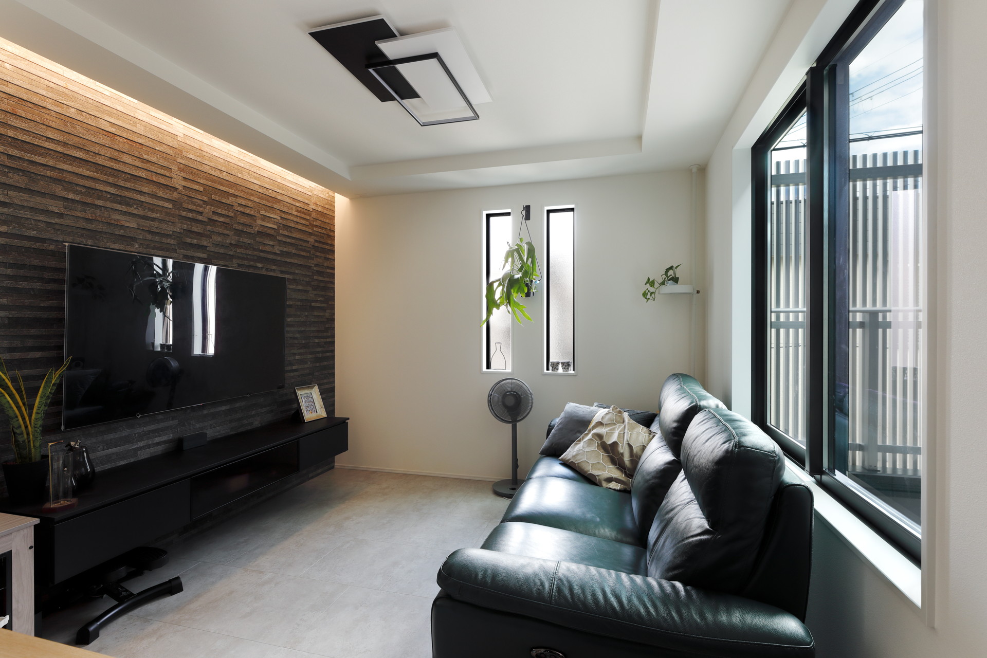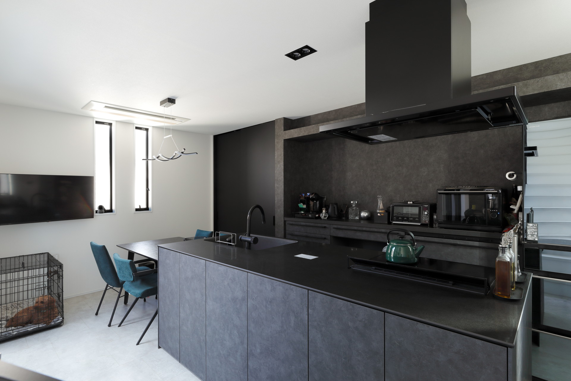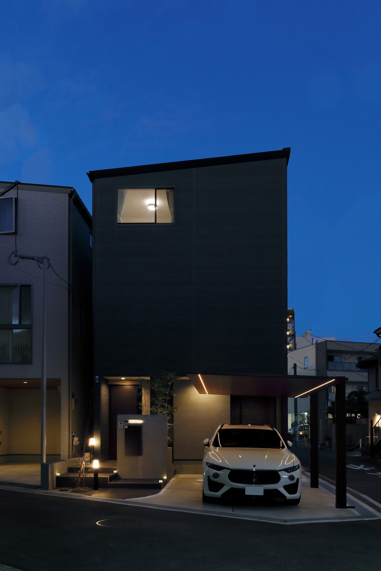 2階建てにすることも予定していたが、3階建にしても標準価格が変わらないというところに加え、空間一つ一つを広く取れるところに魅力を感じ、北摂という利便性の高さと暮らしの豊かさをどちらも実現。インナーバルコニーは外の視線を気にせず過ごすことができ、家族でBBQなども。リビングとキッチンダイニングで挟むようにレイアウトされたインナーバルコニーがあることで、LDK全体が開放感で包まれた奥行き感じる空間になりました。玄関は、框の高さを下げることでホテルのような敷居を低くしたリラックスさを演出。さらに1階から上がる階段は抜け感をプラスし、フロアライトから溢れる柔らかい光とこだわりのペンダントライトで高級感のあるシンプルモダンなインテリアが完成しました。