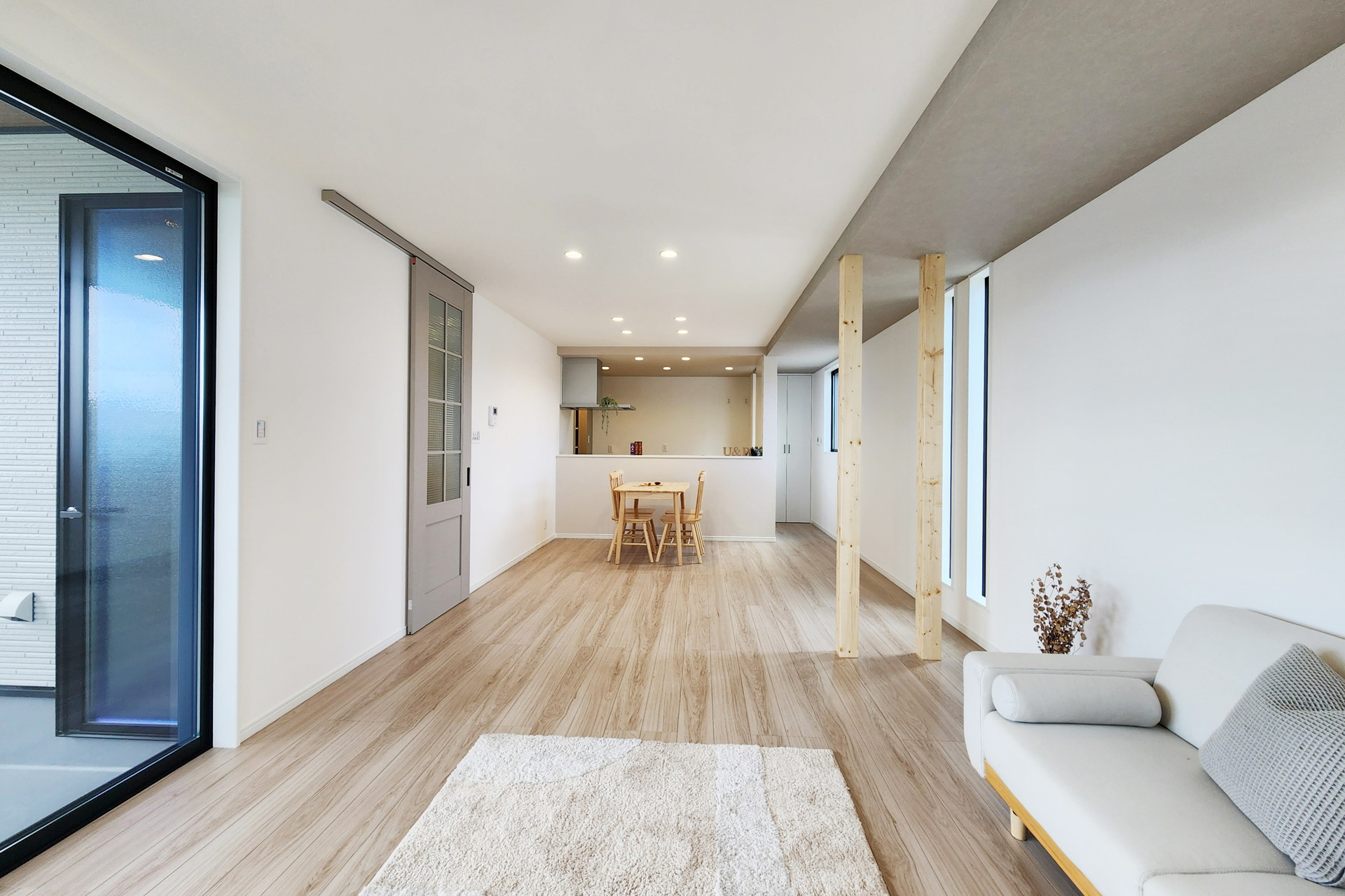 LDKと水回りをワンフロアに集約した家事ラク動線を叶え、南向きにはバルコニーを。『開放感』と『家事の時短』が実現する、永く暮らしやすい間取りにこだわっています。どんなインテリアにも合いやすいアースカラーを用いた「大人カワイイ」テイストで、落ち着いた大人の女性を楽しむインテリアが完成しました。